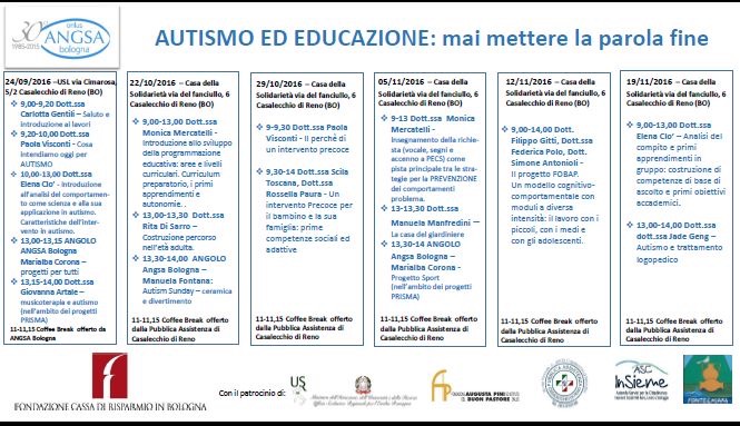 Ecco le giornate di Informazione/formazione che partiranno in settembre organizzate da ANGSA Bologna con il patrocinio dell'Ufficio Scolastico Regionale.