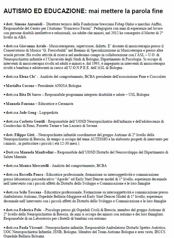 Gli interventi sono stati scelti dalle nostre famiglie e dagli educatori che lavorano per noi. Abbiamo voluto trattare l'autismo da diversi punti di vista (sempre e comunque nel rispetto delle Linee Guida dell'Istituto Superiore di Sanitą). Naturalmente queste giornate sono solo l'inizio.... ci saranno altre giornate il prossimo anno con altri Relatori.